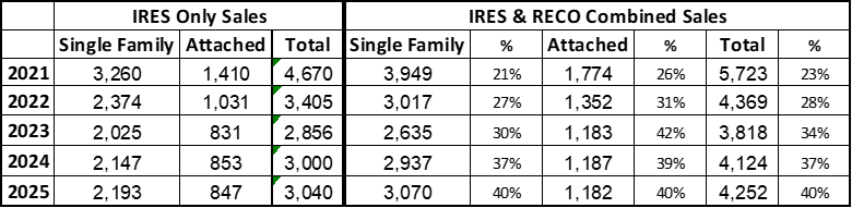 I’ve downloaded and massaged the year-end numbers and this will be the first of several articles talking about how the 2025 Boulder County real estate market performed. In a big change compared to previous years, I’ve finally felt compelled to include RECO data and combine that with the IRES data. Unfortunately, there is no good answer on whether or which way to do this. By including RECO data, I’m introducing some level of duplicate sales that are not scrubbed by the de-duplication systems within IRES. I think that error in the data is smaller than the data I’m missing by not including RECO. As you can see in the chart below, the number of sales in Boulder County being solely reported in RECO is increasing every year and has reached a level (40% in 2025) that I no longer feel I can exclude in the name of data integrity and the utility of keeping the same methodology for historical comparisons. As usual, this analysis will miss any sales not reported to either MLS system. The percentage column in the chart below is the percentage increase in sales when I used the combined IRES & RECO data compared to just using the IRES data.