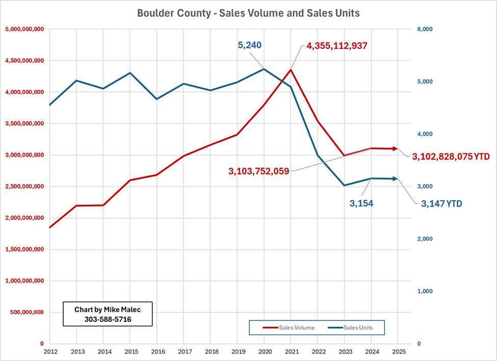 We have defined the floor in the below chart of Boulder County Sales Volume and Sales Units over the last 3 years. While 2024 and 2025 show improvement off the rebound point, it has been minor. Also striking how close the 2025 YTD numbers are to the 2024 numbers. Only 7 closings different when I pulled this data on Dec. 23rd.